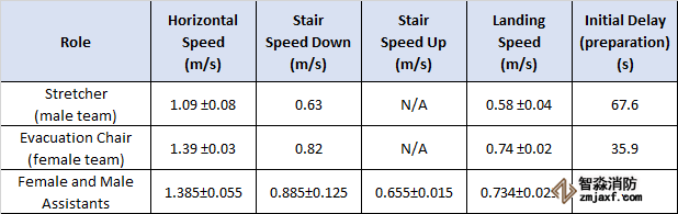 在醫(yī)院里,日班由七名助手組成。使用疏散椅進行疏散準備需要兩名助手,但在疏散椅子的過程中只需要一名助手。為了表示一名助手正忙著準備病人,疏散椅的模擬假設只有六名助手參與了疏散運動。對于夜班,只有四名助手,在疏散期間,每個擔架需要四名助手。