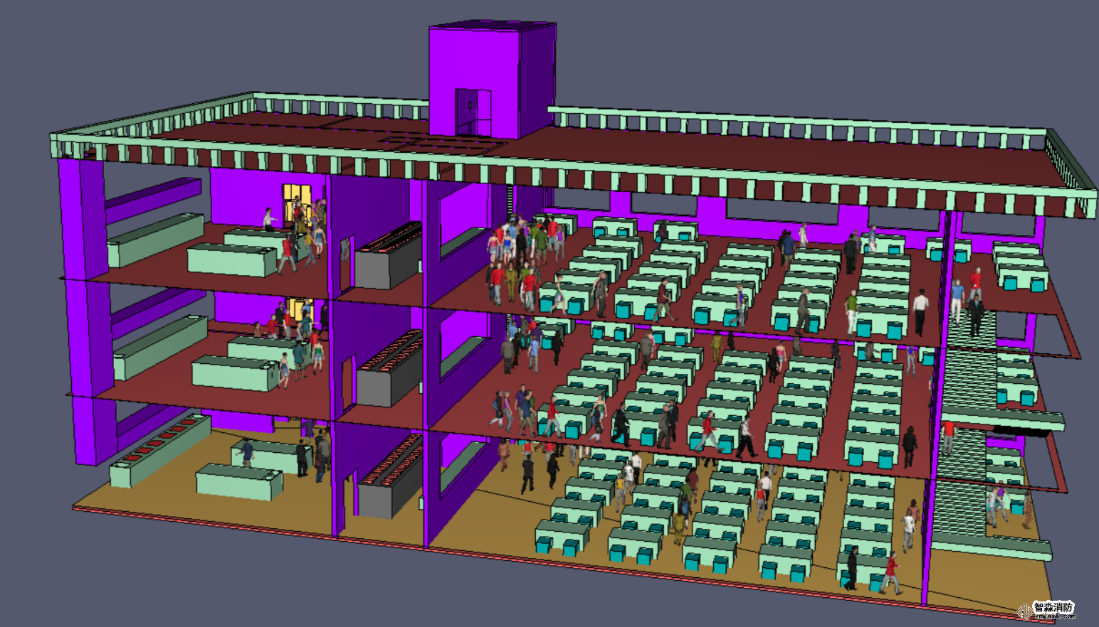 某三層樓食堂火災(zāi)與疏散模擬分析,食堂分為食品制作區(qū)域和就餐區(qū),模擬視頻操作區(qū)(廚房)意外著火情況下,火災(zāi)煙氣蔓延特性以及對(duì)人員的危害,進(jìn)而模擬人員疏散,調(diào)整疏散方案至全數(shù)人員能夠到達(dá)安全區(qū)域。