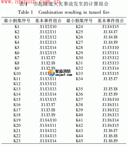 =(X2+A2)X1(B2+B3+B4+X7) =(X2+X3+X4+X5+X6)X1(X7+X8+X9+X10+X11+X12+X13+X14+X15) 經過布爾代數運算,引起隧道火災事故發生的組合計算結果見表1。