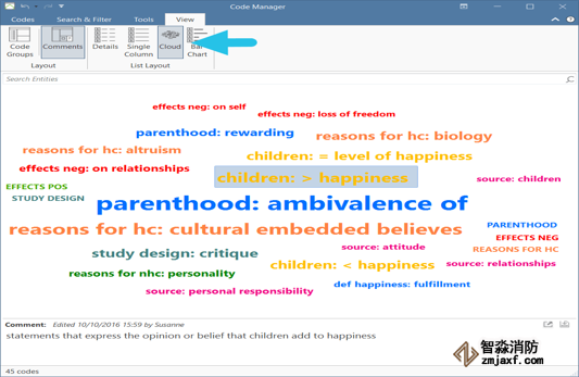 云視圖和條形圖視圖中的代碼與列表視圖中的代碼具有相同的上下文菜單。因此,您可以按照從列表視圖中使用的相同方式處理代碼,即合并、拆分或重命名代碼、編寫注釋、創建智能代碼等。您可以通過代碼訪問新的視圖選項Windows版本中的Manager View選項卡,以及Mac版本中的工具欄: