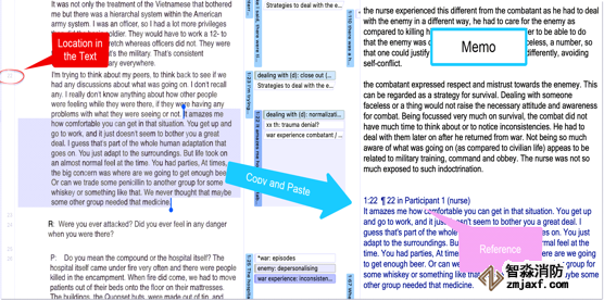 如果您復制引用并將其粘貼到編輯器中,無論是ATLAS.ti中的注釋字段或備忘錄,還是ATLAS.ti之外的Word文檔,也會添加此引用的引用。參考文獻包括:引用編號、位置和文檔名稱。例如,如果您想在報告中包含關鍵引用,則將引用復制到備忘錄中很有用。
