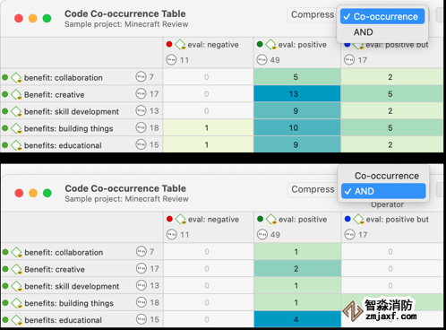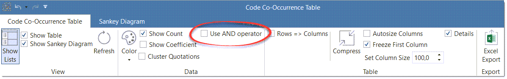 您現在可以在代碼共現表中的共現和AND運算符直接切換。這允許您僅搜索編碼完全相同引用的代碼: